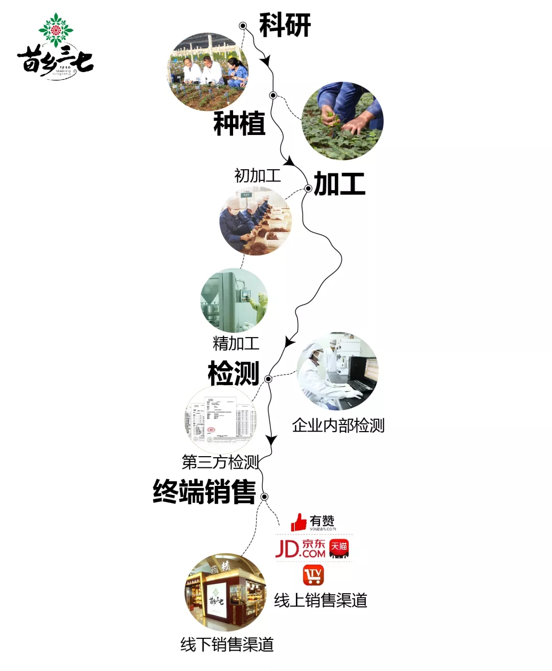 ? ? ? ?苗鄉(xiāng)三七為保證三七產(chǎn)品品質(zhì),構(gòu)建從科研、種植、加工、銷售、服務(wù)為一體的全產(chǎn)業(yè)鏈,奠定做高品質(zhì)三七的實(shí)業(yè)基礎(chǔ)。