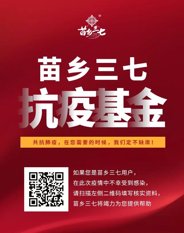 向防治疫情前線捐贈價值87萬元三七產(chǎn)品的同時,苗鄉(xiāng)三七成立150萬元抗疫基金,將為此次疫情中不幸感染的苗鄉(xiāng)三七用戶提供專項幫助!