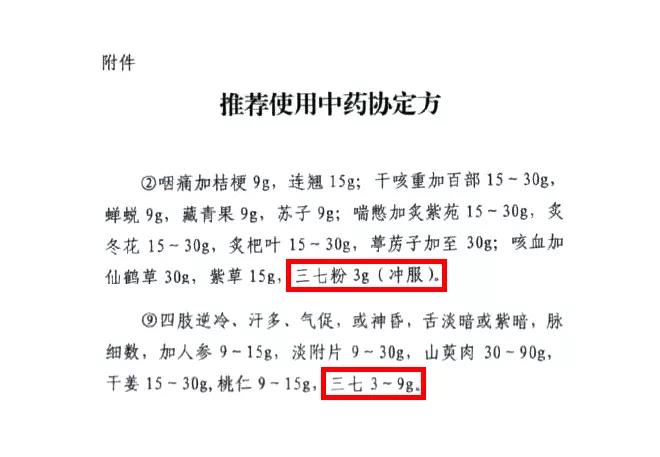 在2020年2月2日武漢市新冠肺炎防控指揮部醫(yī)療救治小組關(guān)于推薦使用中藥的協(xié)定方名單中二處使用三七,并強(qiáng)調(diào)2020年2月3日24時(shí)前確保所有患者使用中藥。