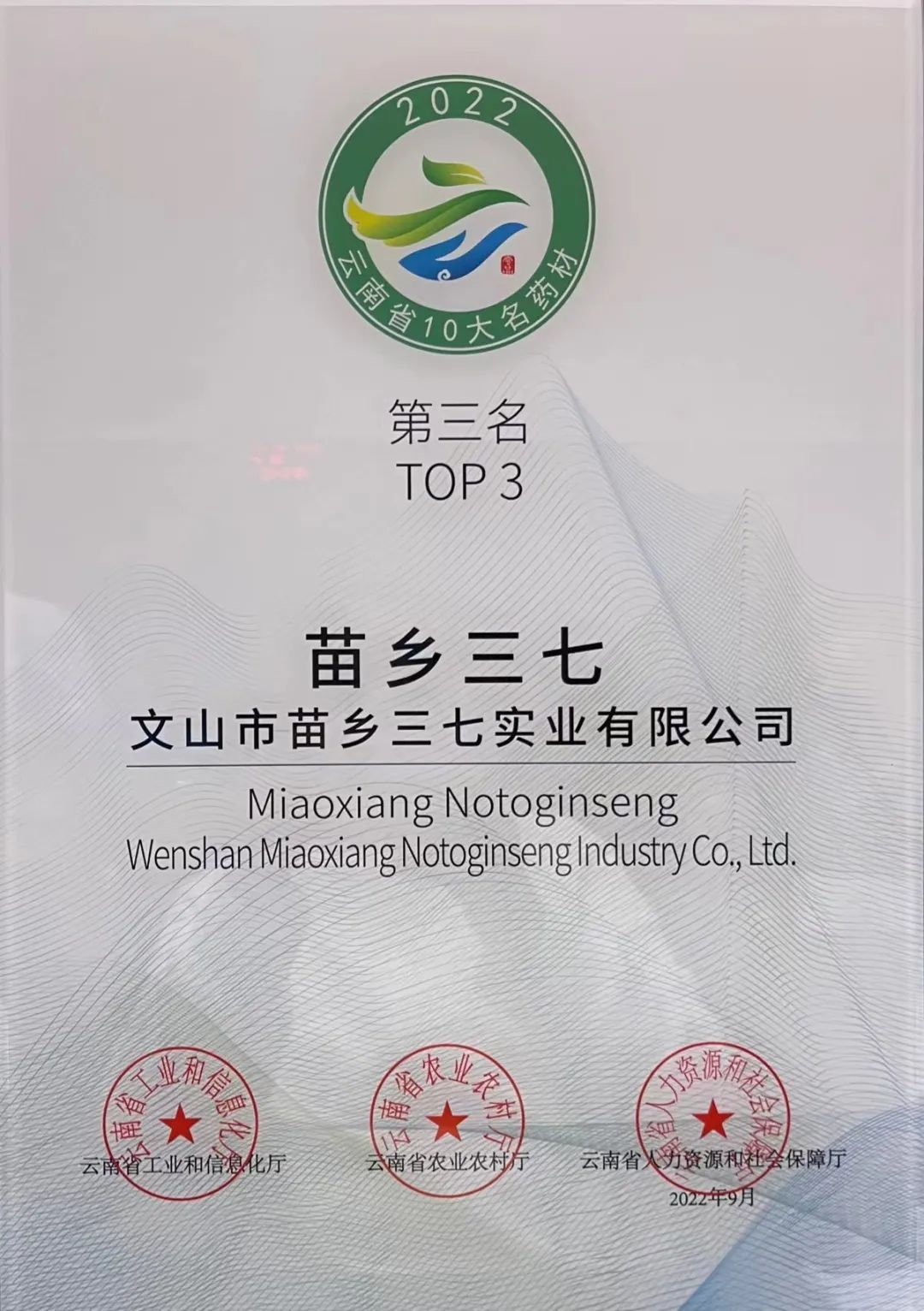 苗鄉(xiāng)三七獲評(píng)2022年云南省“10大名中藥材”第三名,并已連續(xù)兩年獲評(píng)云南省“10大名中藥材”。