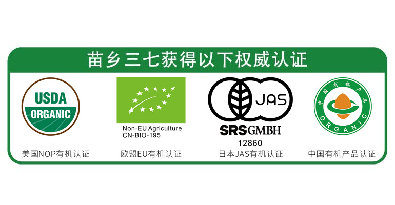 自2001年起,苗鄉(xiāng)三七相繼并持續(xù)獲得日本JAS有機(jī)認(rèn)證、中國(guó)有機(jī)產(chǎn)品認(rèn)證,成為目前市場(chǎng)上高品質(zhì)三七品牌代表。